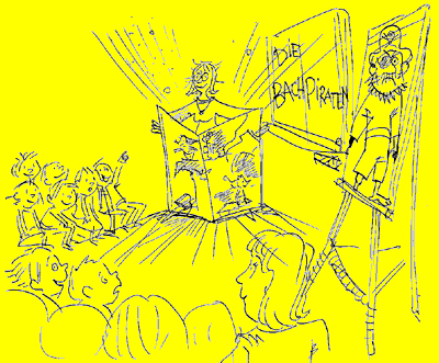 ![]() In diesem BILDERBUCHWERKSTATTBERICHT wandeln die Kinder, zusammen mit den Bildererfindern und Kinderbuchillustratoren Karin Schliehe und Bernhard Mark, auf den Spuren einer BUCHENTSTEHUNG. Bei der Veranstaltung, in der sich Worte und Bilder ergänzen, während gleichzeitig Zeichnungen am Flip-Chart entstehen, bestimmen die Kinder das Geschehen durch ihre Vorschläge und Ideen, die sie zum Schluss auch selber aufs Papier bringen, mit. Sie sehen, wie aus einem Stiefel am Bachbett ein Piratenschiff wird, warum sich ein Kamm in eine Leiter verwandeln kann und weshalb kleine Waldtiere plötzlich aussehen wie eine wilde Piratenbande und entdecken, dass nur in der Welt der eigenen Phantasie, nichts mehr wirklich ist, aber alles möglich werden kann. Anschaulich, mit Hilfe von großen Bildtafeln,